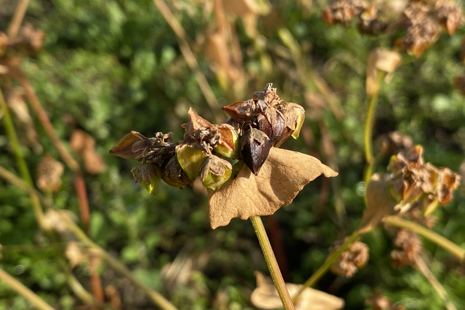 そばの実はだいぶ成長が進んで、丸くふくよかな形になり、色はこげ茶色になってきました。