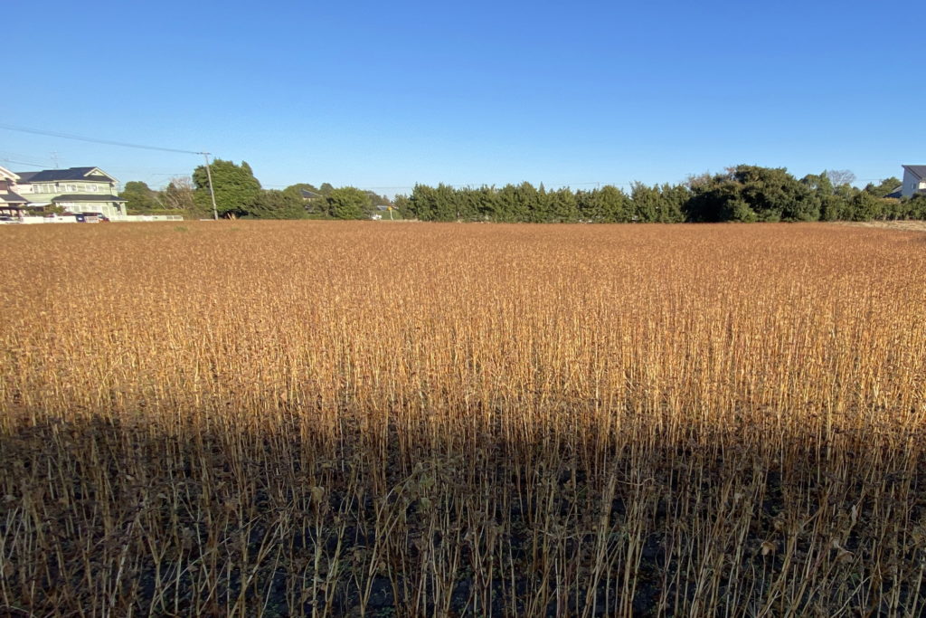 雲一つない澄んだ青空。そしてこげ茶色のそばの実と赤茶色のくきや葉が広がるそば畑は、美しい絵画のようでした。