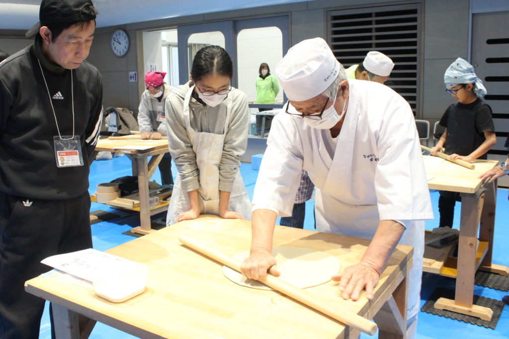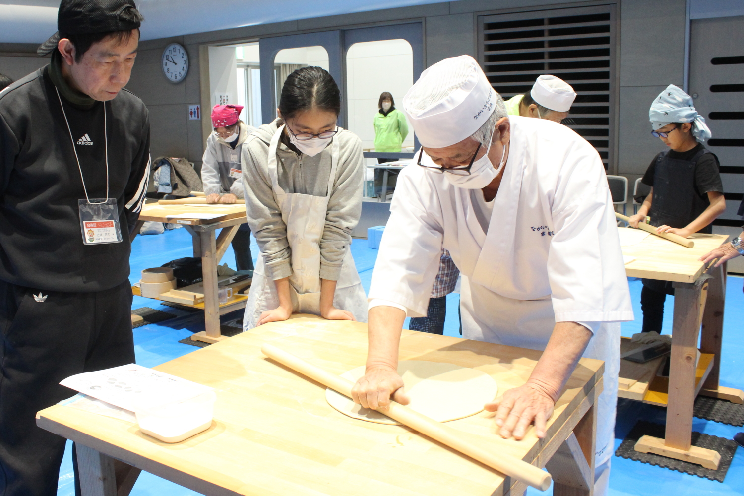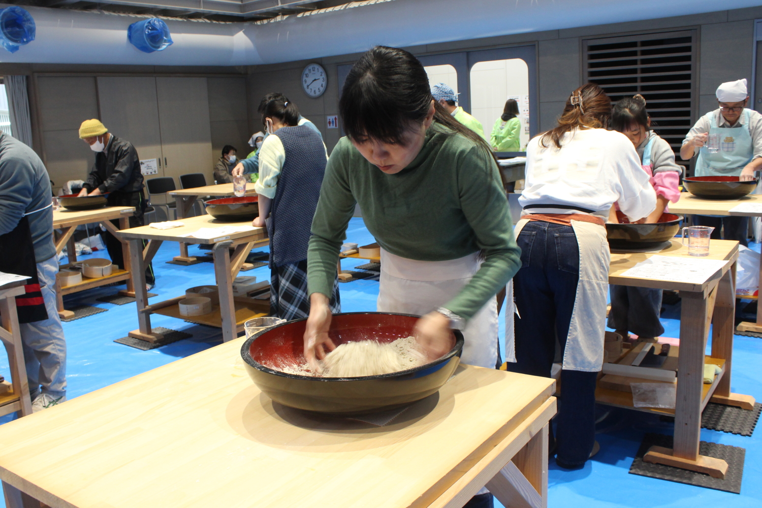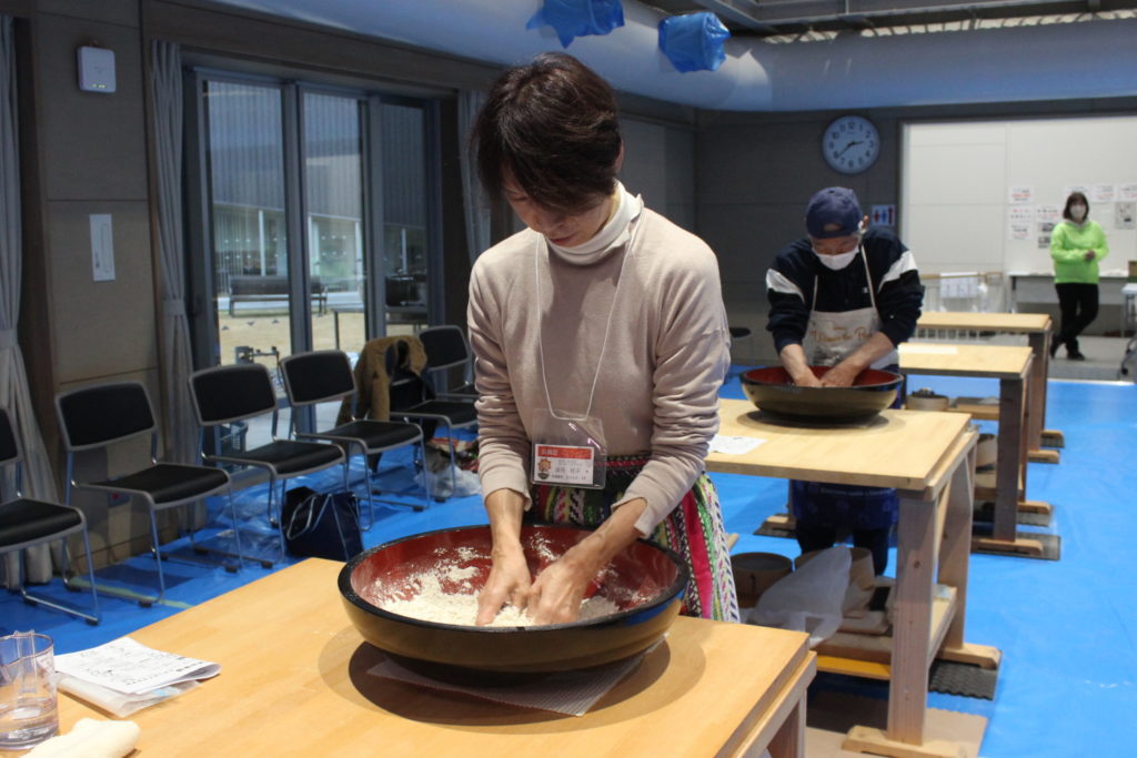 お手本実演が終わると、お待ちかねの「そば打ち体験」の開始です。